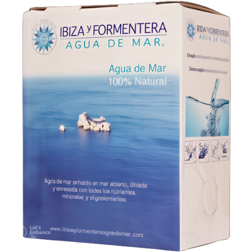 Agua de Mar recogida en alta mar pero no en la zona planctonica, los minerales se encuentran en su forma inorgánica naturalmente por lo que no se recomienda para beber, sino para los demás usos del agua de mar.